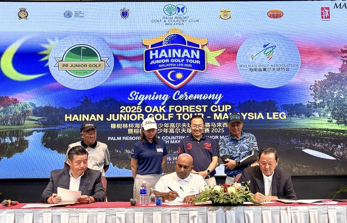 The tournament’s official signing and launch ceremony was held on 9 May 2025 at Palm Resort Golf & Country Club, attended by key figures including Organising Chairman Mr. Jin Ang, Golf Operations Manager Mr. Malek Musa, and Hainan Golf Association’s Overseas Liaison Officer Mr. Kenny Ng.