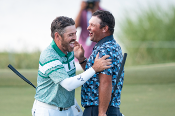 Patrick Reed of 4Aces GC and Captain Louis Oosthuizen of Stinger GC hug on the 18th green after their four-man playoff battle in the final round of LIV Golf Dallas. (Photo by LIV Golf)