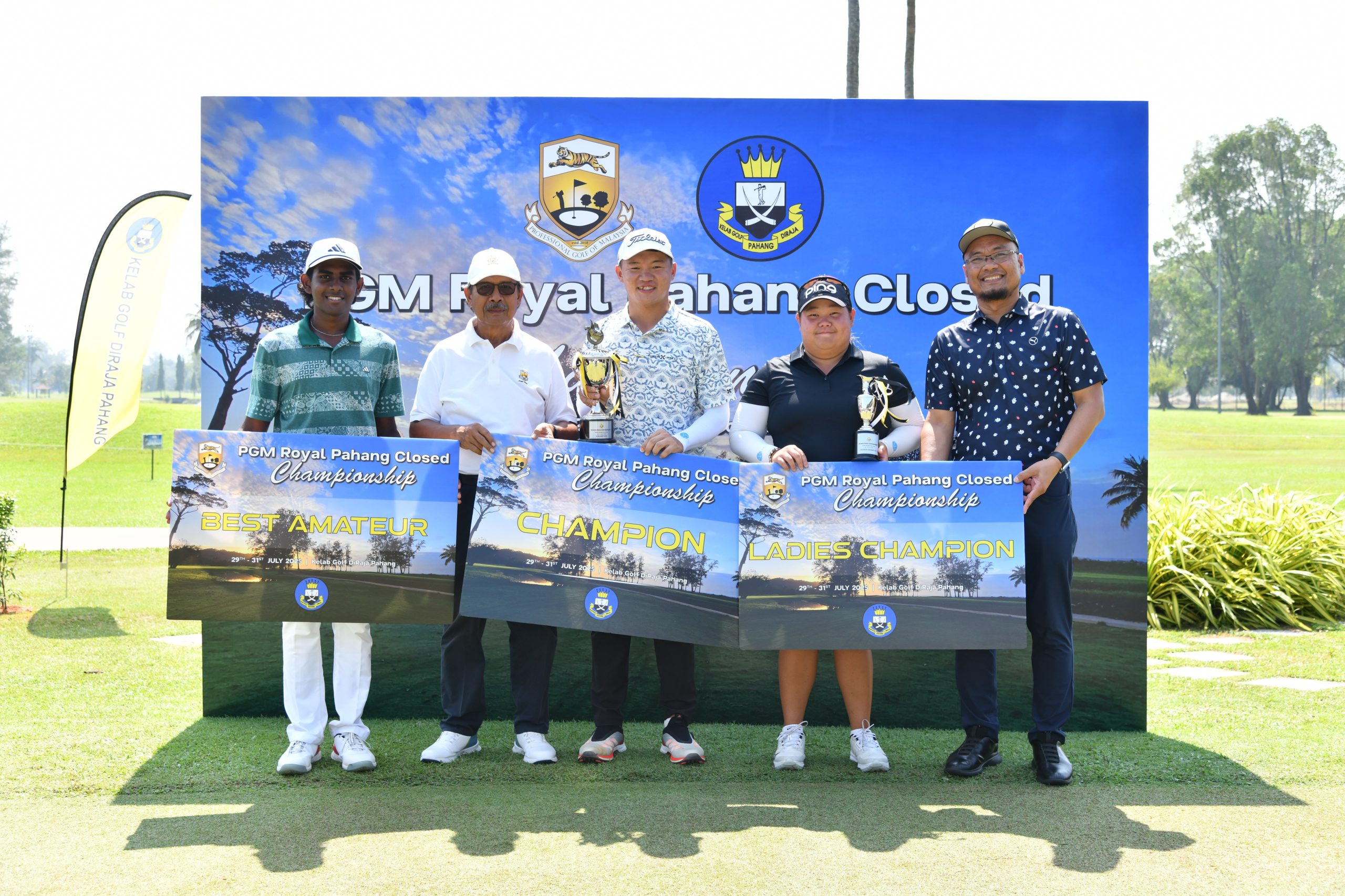 Nateeshvar Ganesh (Best Amateur Winner), En Nik Mustapha (General Manager of PGM), Edven Ying, Champion, Mirabel Ting, Ladies Champion and Dato Suhaimi Sulong, Honorary Secretary of Kelab Golf DiRaja Pahang.